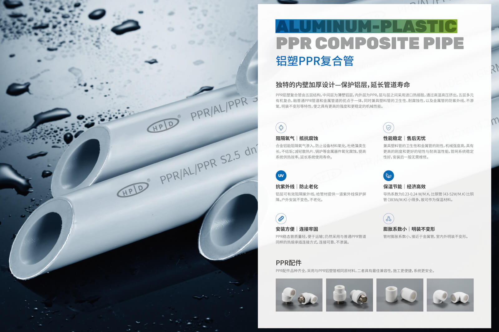 铝塑ppr 复合管抗紫外线,防止材料老化——铝层可有效阻隔紫外线,给管材提供一道紫外线保护屏障。户外安装不变色、不老化。