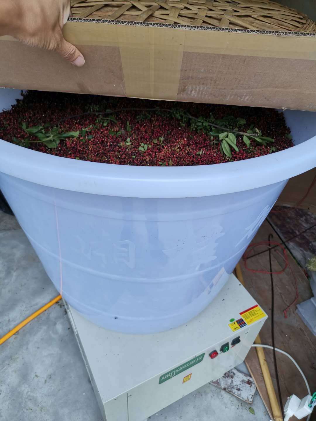 花椒开始烘烤时,每隔1小时需要排湿和翻筛一次,之后随着花椒含水量的降低,排湿和翻筛的间隔时间可以适当延长。花椒烘干后,连同烘筛取出,筛除籽粒及枝叶等杂物,按标准装袋即为成品。
